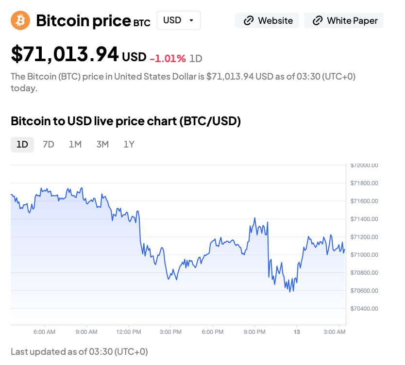 At the time of reporting, BTC is trading at $71,013.94, down 1.01% on the day.