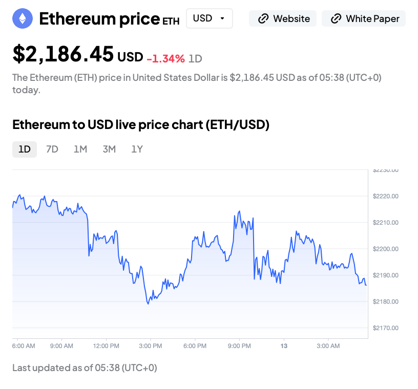 The latest chart shows Ethereum trading at $2,186.45, down 1.34% on the day.