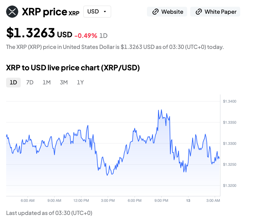 The latest price action shows XRP continuing to consolidate above the broader $1.30 support zone, with the market repeatedly defending the mid-$1.32 area. That keeps the recent structure intact and supports the broader view that the XRPUSDT price remains in accumulation rather than breakdown.