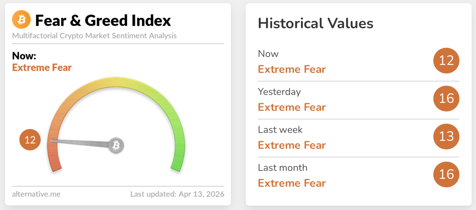 As of April 13, 2026, markets are still at a turning point, but the latest price action shows that conviction remains selective. The Fear and Greed Index sits at 12 (Extreme Fear), as sentiment shifted with growing weariness at the unyielding macro backdrop.