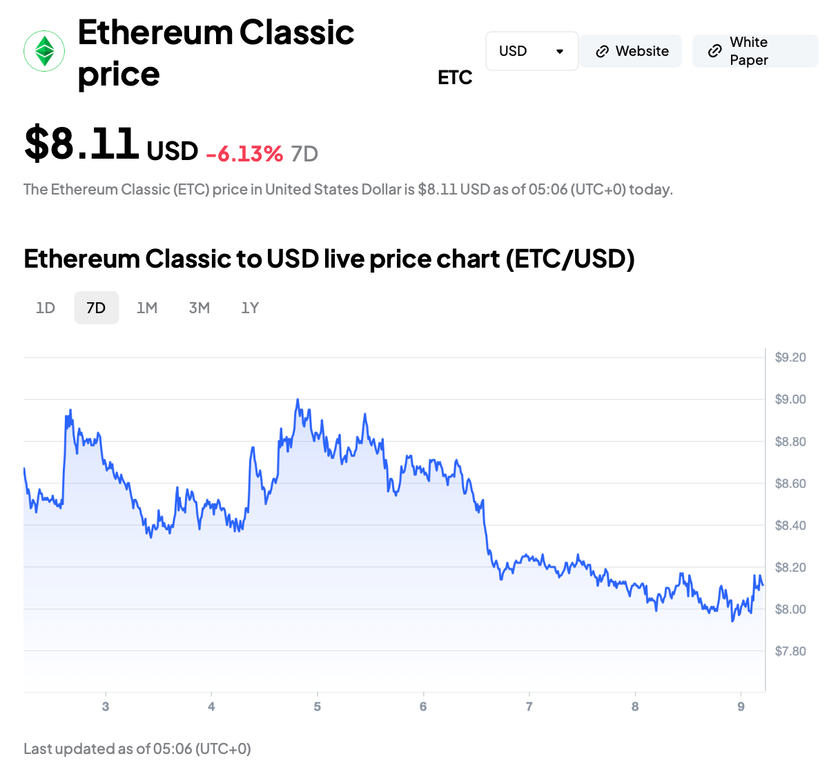 ETC is trading at $8.11, at the time of reporting (05:06 UTC), after trading as high as $9 on March 5.