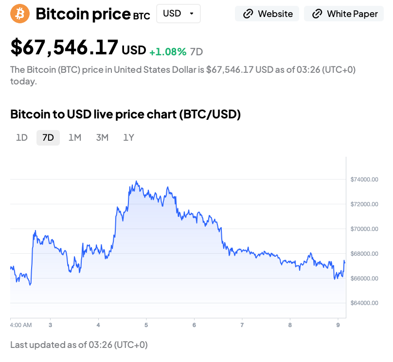 MarketWatch noted that analysts were already warning about a possible false breakout unless BTC could hold above that zone on pullbacks. That caution looks justified now that spot has slipped below it again. Bitcoin price is $67,546 at the time of reporting (03:26 UTC), and is up 1% in 7D.